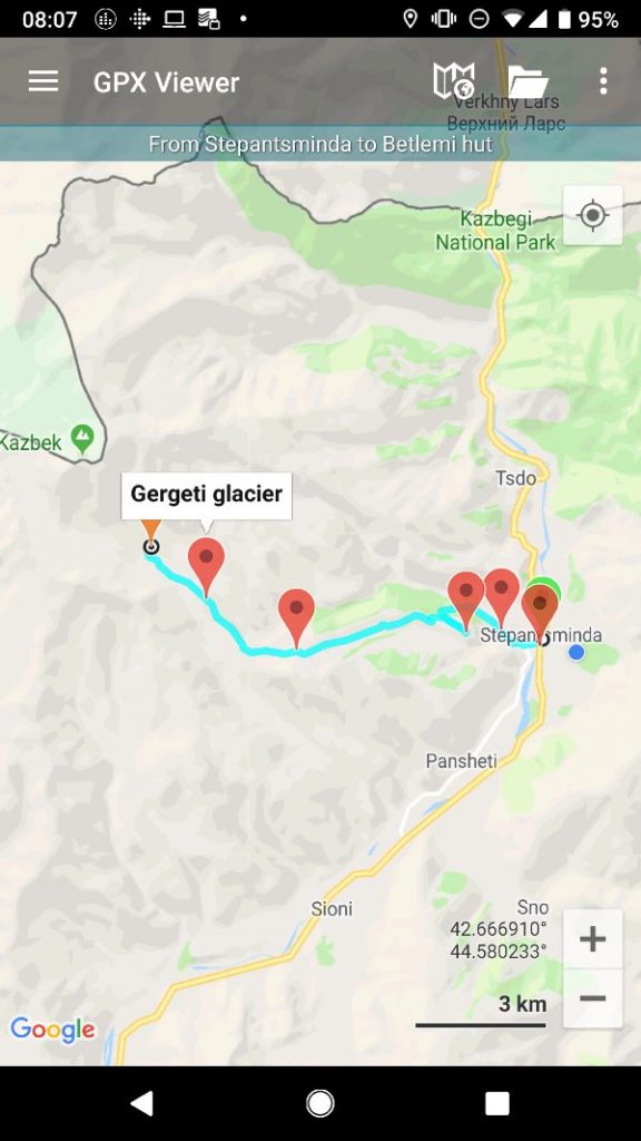 - Put a GPS map on your phone. Use an app like GPX viewer and download a GPX or KML file from Caucasus Trekking. Don’t rely on Google Maps for this journey. It doesn’t show anything useful.